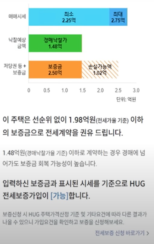 경매에 넘어갈 경우 손실이 우려되는 금액도 쉽게 볼 수 있도록 그래프로 확인하실 수 있으며 해당 주택이 HUG 전세보증금반환보증에 가입 가능한 물건인지도 안내됩니다.