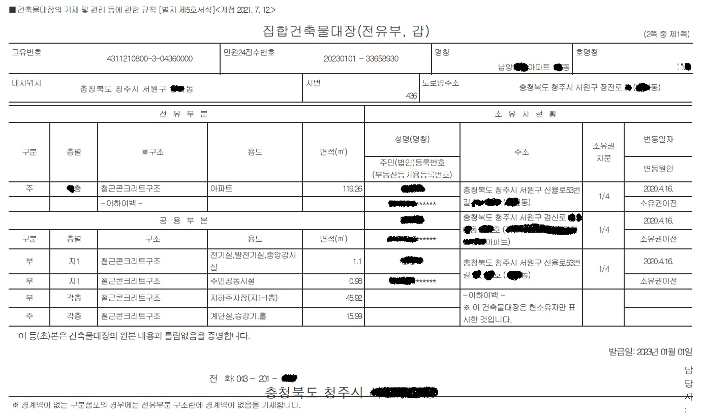 하지만 소유자현황은 등기사항전부증명서가 기준이기에 건축물대장이 아닌 등기사항전부증명서로 확인하는 것이 더 정확합니다.